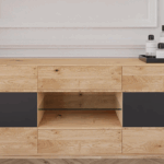 W komodzie zastosowano mechanizm „push to open” – drzwi i szuflady otwierane są na dotyk. W szufladzie zastosowano również prowadnice z cichym domykiem zapewniającym łagodne zamykanie.