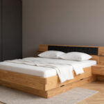 Nowoczesne łóżko dębowe z szufladami i wiszącymi szafkami nocnymi.