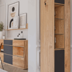 Model o wysokości 205 cm i szerokości 61 cm prezentuje się lekko, a jego proporcje pozwalają na ustawienie nawet w mniejszych przestrzeniach. Centralną część mebla stanowi przeszklona witryna, która subtelnie podkreśla zawartość półek – idealnych do ekspozycji ceramiki, szkła, książek czy dekoracji. Szklane półki w części przeszklonej zwiększą funkcjonalność.